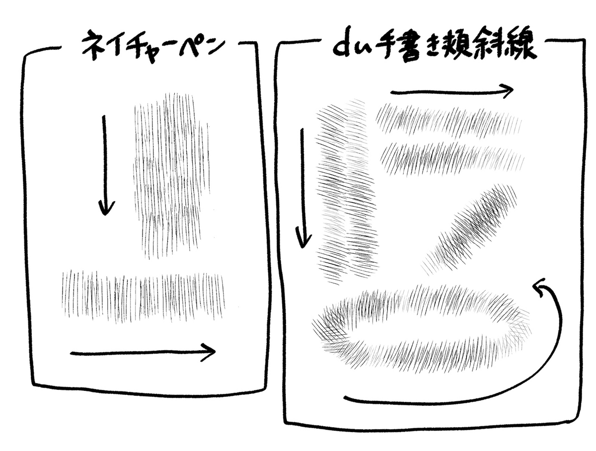 なので、影を書き足したりする時に、ササッと気軽に塗れるお手軽さがあって、めちゃくちゃ汎用性が高い。斜線の向きが固定ではないためカケアミも作りやすいし、ネイチャーペンの上位互換という感じ。